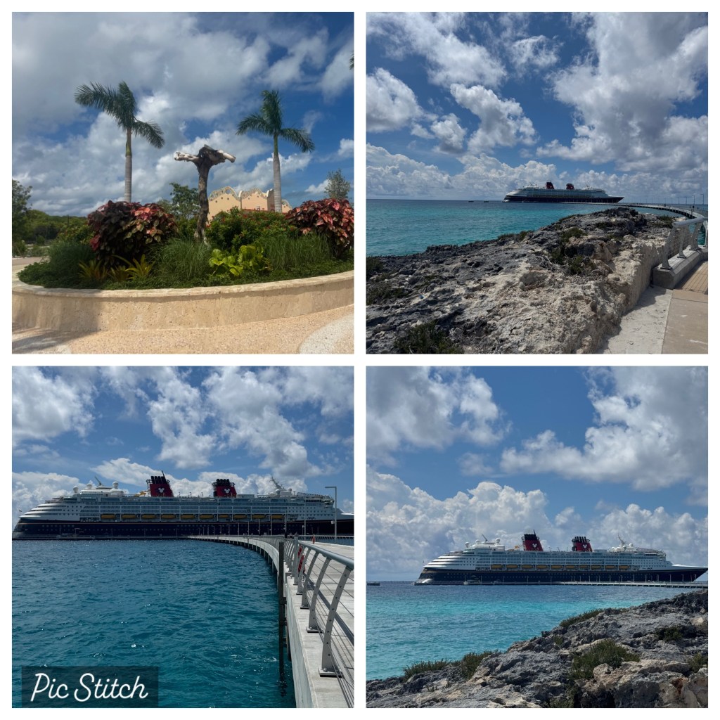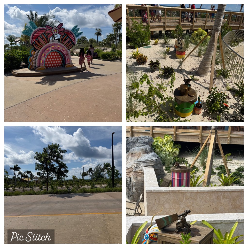 We saw one of the kids water play areas that looked fun. Lots of area to splash and play and still be close to the beach. After checking that out we headed over to the adults area to go in that beach. All the chairs close to the ocean were taken so we got some chairs up on the dune, but still had a view of the ocean. There were a few rain clouds hanging around so we decided to go in the water incase the rain started. The adults beach is the end of Disney property. Since people live on this island it can’t be a private beach so people could show up on the beach. There are other ships that also have their personal spots on the island. We could see a carnival ship from where we were and Princess cruises is supposed to have an area too. The water was really pretty. The sand had a little pink tint to it from crushed shells. It was pretty. A lot more waves than castaway since there isn’t a rock barrier to slow the waves but it was really nice. We stood in the water for a little while until it was time for the Junkanoo.