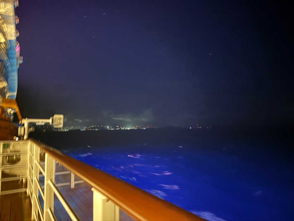 Dinner tonight was back at 1923 for pirate night. Since we were back in 1923 we had a nice window view as well sailed away. That is one of the problem at times when doing a 5:45 pm dinner is the ship is starting to leave port and you can’t always see what is going on when in the dinning rooms.