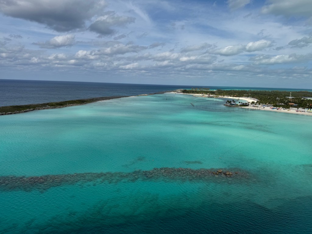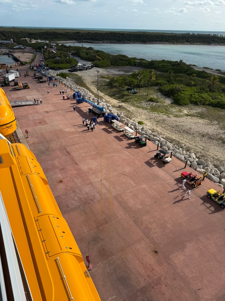 It was a slow morning we don’t pull into Castaway until 10am, so no rush this morning. Up at the buffet was Churro Mickey Waffle day, so the lines for that were really long. Luckily I am not a big churro waffle fan, so I went to the shorter lines to grab some food. We had thought about doing the 5K, but figured it would be a little warm since we didn’t get in until 10am. The fun thing about being Port side on Castaway Day is watching people work and prepare all the things ready for people to get off the ship.
