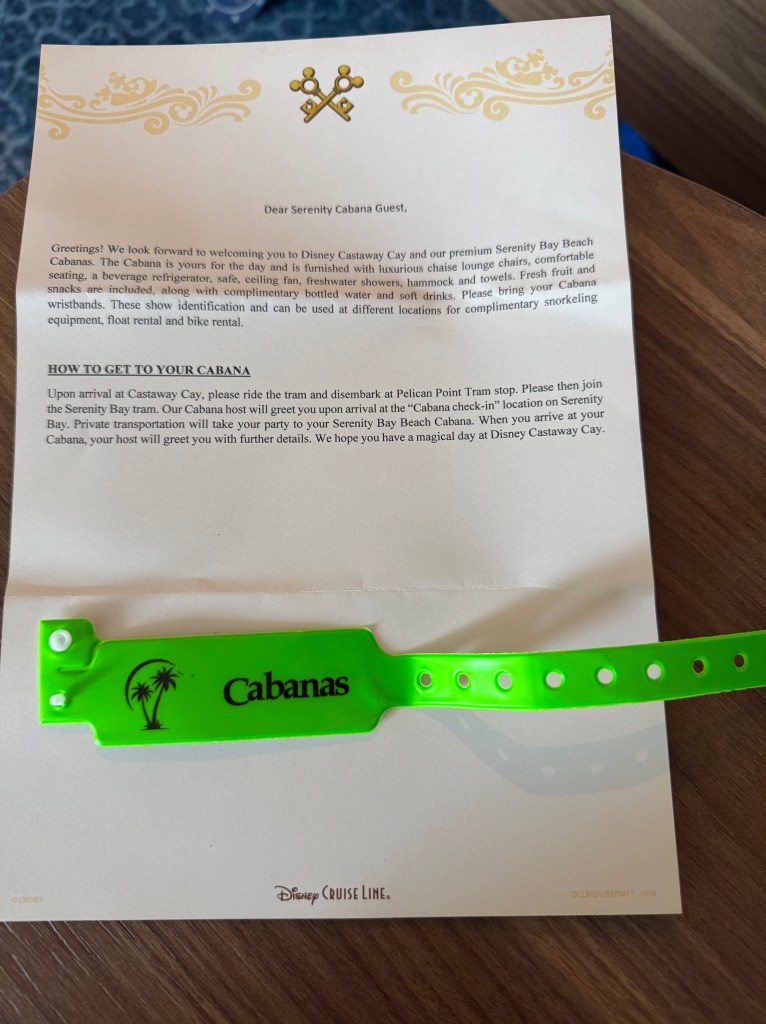As we headed to Tram stop 2 to catch a shuttle over the Serenity Bay the adults areas. We stopped for some shopping. Then it was time to catch the tram and find our Cabana! We had green wristbands that let the staff know we were in a Cabana. We checked in at the booth and headed over on the tram. Once we got off the tram the Concierge staff was waiting for us, so we hopped into the golf cart and were taken to our Cabana!