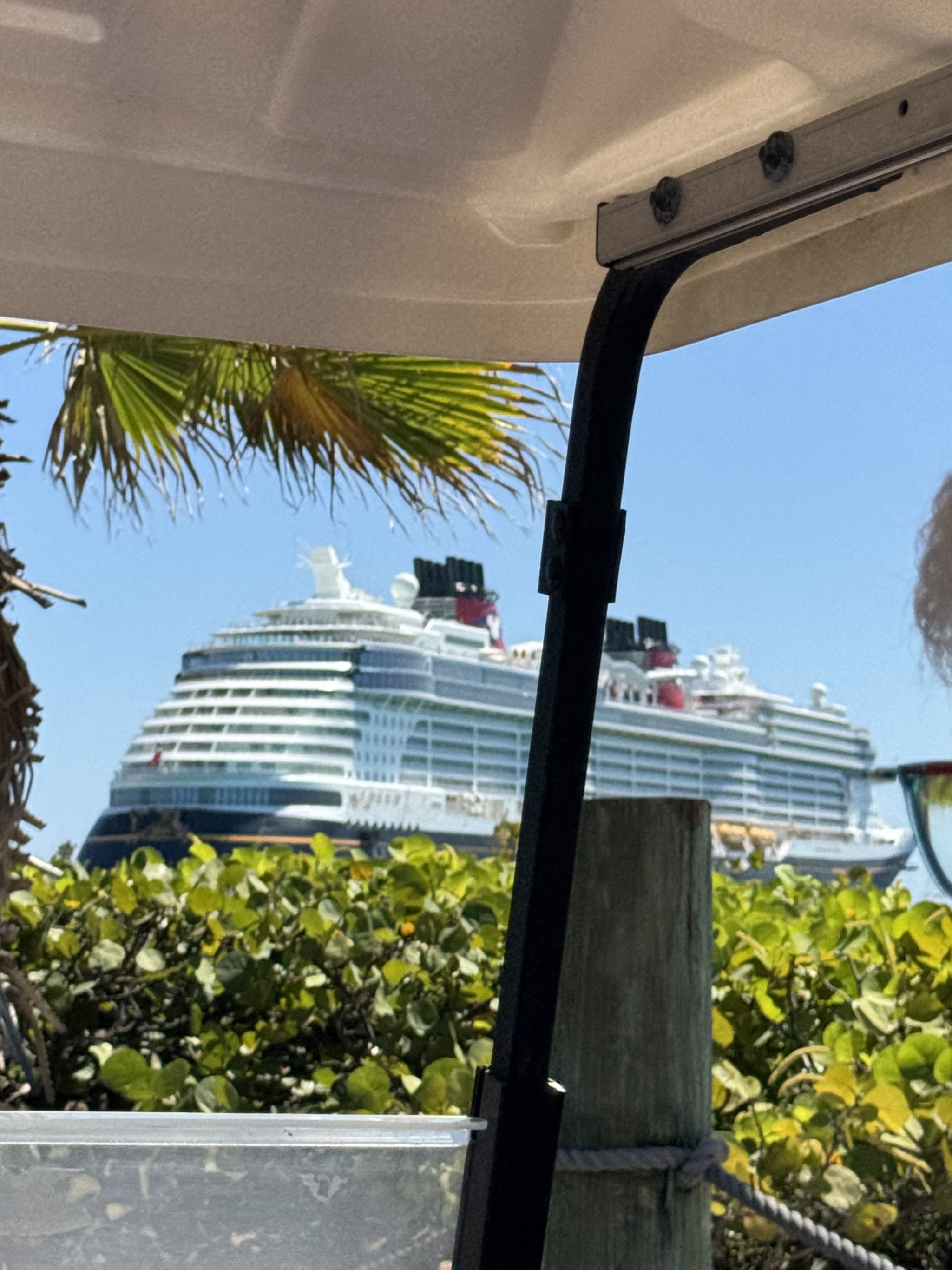 About 2:40pm the Cabana host came buy to pick us up and take us back to the ship. They have to try and get all the people back to the ship before they have to be on board. The fun part of this they take you right to the gangway. We show one keycard to get through the first check and then we are dropped right off next to the hand sanitizer stand. It is a lot of fun to drive past people on the way to the ship. Plus you can see some staff only areas as you drive around.
