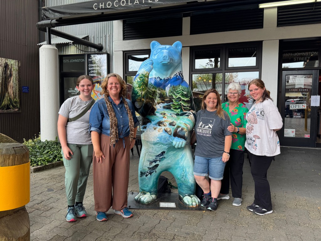 After breakfast we headed over to Canada Place to pick up the hop on hop off trolley. That area was super crazy- 2 cruises had just arrived and there was a convention in town, so the street was blocked off. So that meant we had to find out where the trolley stop had been moved to, luckily I remembered from a few years ago to check a parallel street. We found a trolley loading up and were able to hop right on. We rode the trolley around until Granville Island.