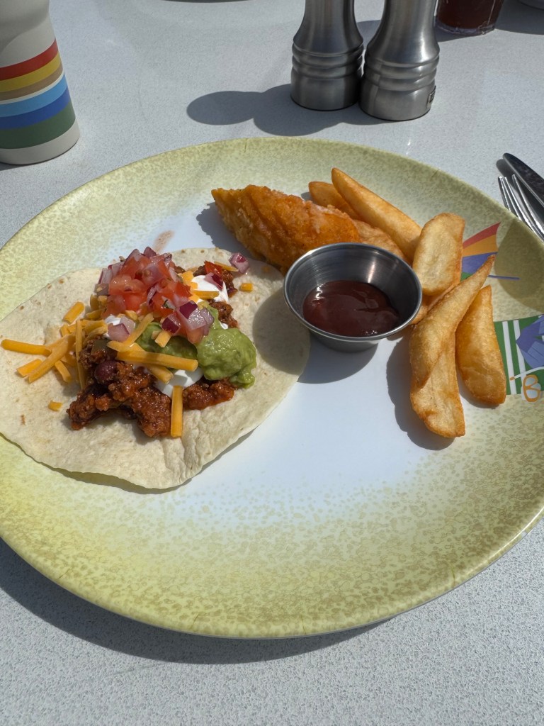 Luckily there were blankets outside that helped. Once it was time for lunch we headed into Cabanas to see what good things they had. We found a seat outside in Cabanas the sun was finally shining and it felt nice. We go to see a whale off in the distance. You could see it blowing water from its blow hole.