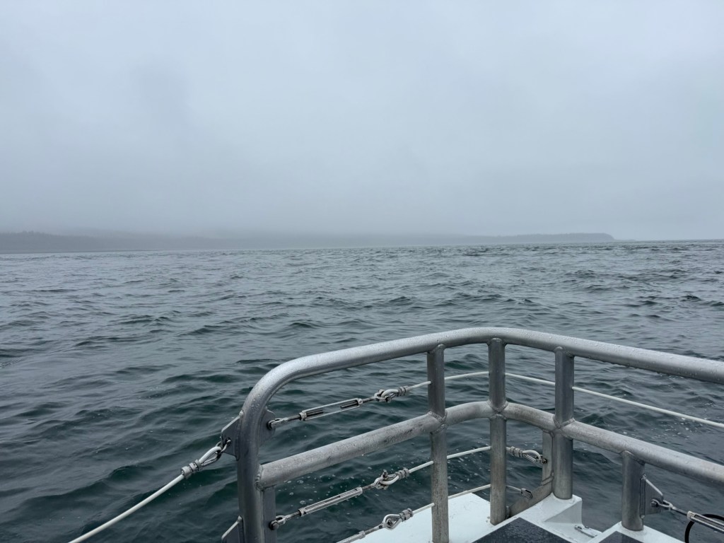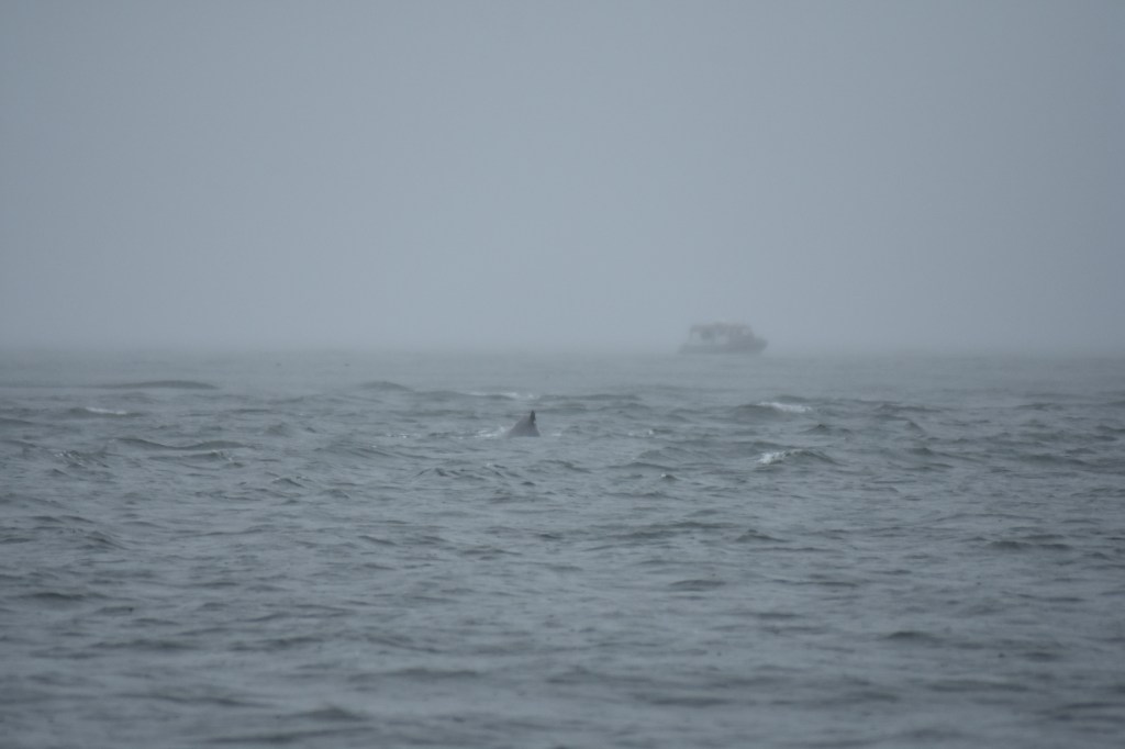 Super foggy, rainy and bumpy out on the boat. Had to keep a hand on the rail especially since we were close to the water. Jennah was the first one to spot a whale and shout out so Captain Andy could move the boat around and get a good view of the animals.