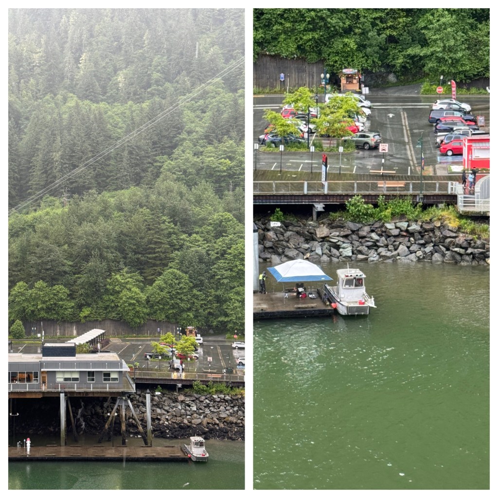These 2 photos show the difference in the tides during the day. If you look at the small boat in the photo on the left taken at 6:31 am and the photo on the right was taken at 4:50pm. Juneau gets 2 high and low tides during the day. The next low tide was 8:29pm we started the see the water levels drop before it was time to leave.