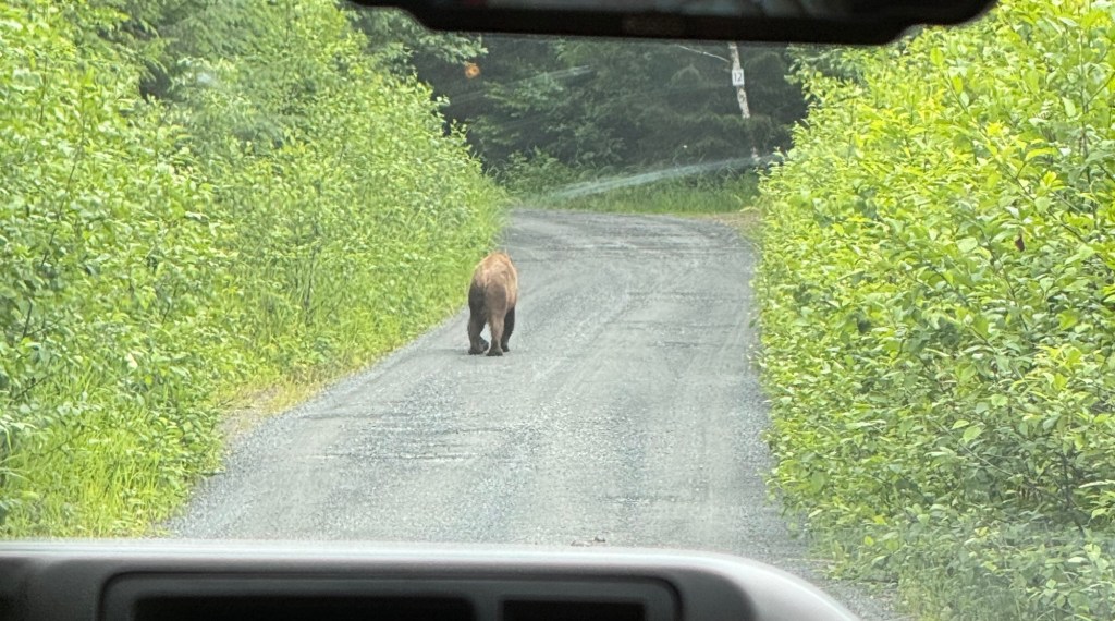 Jennah, Mom and I went on a bear walk. We boarded a bus and headed away from the town. We drove through Hoonah which is super small one gas station and one grocery store.
