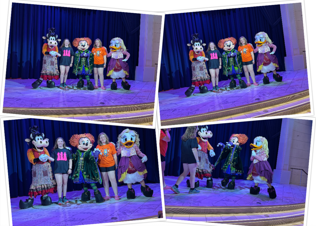 After lunch went back up to Deck 13 to sit in the shade and just relax while the girls went off and did the slides again. We decided to then change and head down to do some more pictures. The girls seemed to have fun doing the pictures. Since it was a Halloween cruise the Sanderson sisters were there.