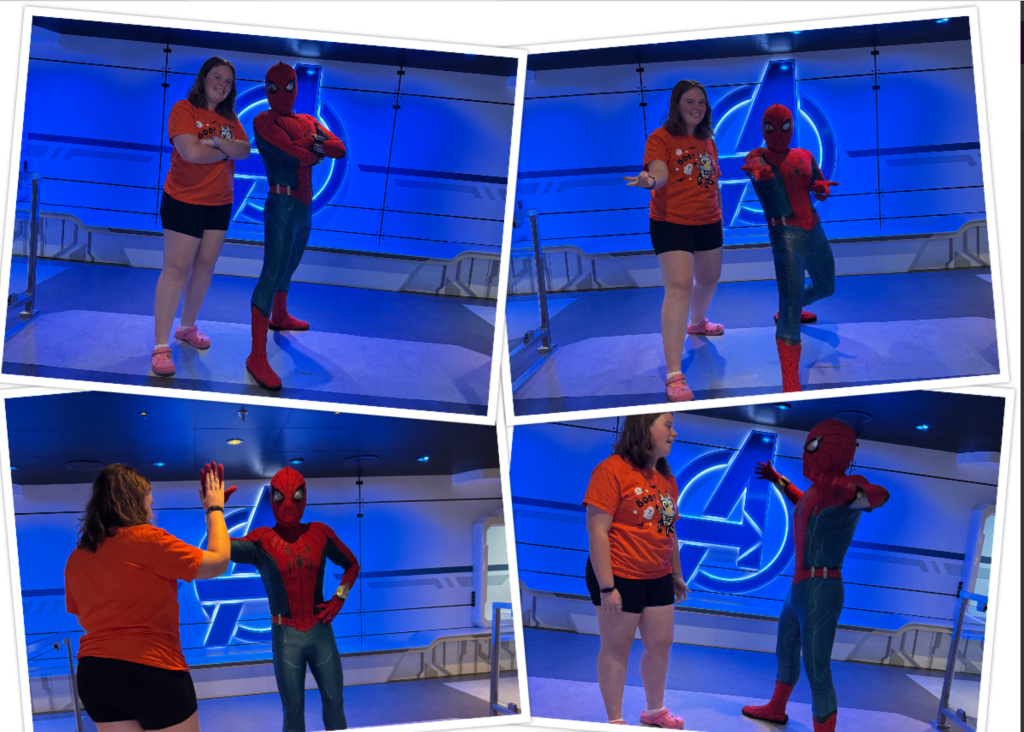 We had some time between seeing the Sanderson Sisters and when Bella wanted to see Spiderman. We went to the Wishing Star Cafe to share the fun Halloween drink! Since it was really a dessert in a glass we shared the drink. Then it was time to head back to the kids club for pictures with Spiderman. He was short which of course makes sense since he is supposed to be a high schooler.