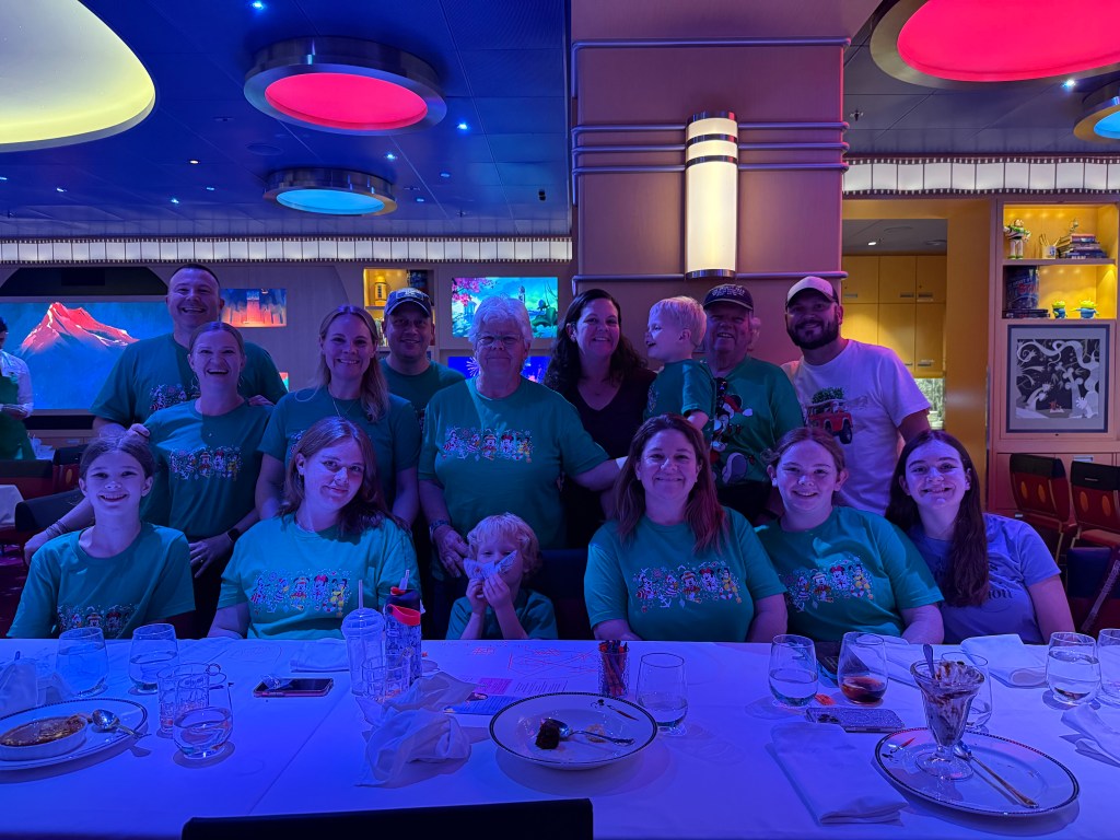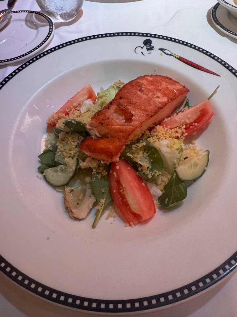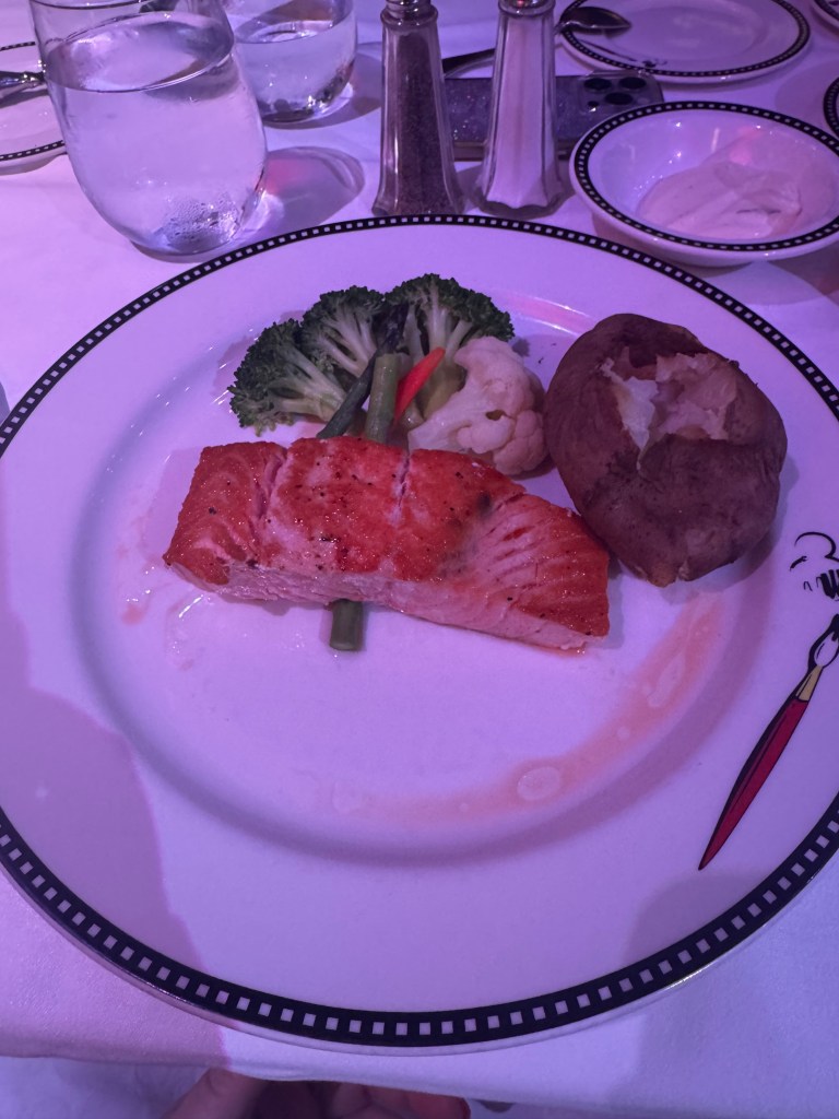 First night for dinner was at Animators Palate. I started with the fried calamari. It was really good. Then I had salmon and baked potato. Dessert was the Magical Express Sundae. We had a large group, so our servers only had our table to try and take care of.