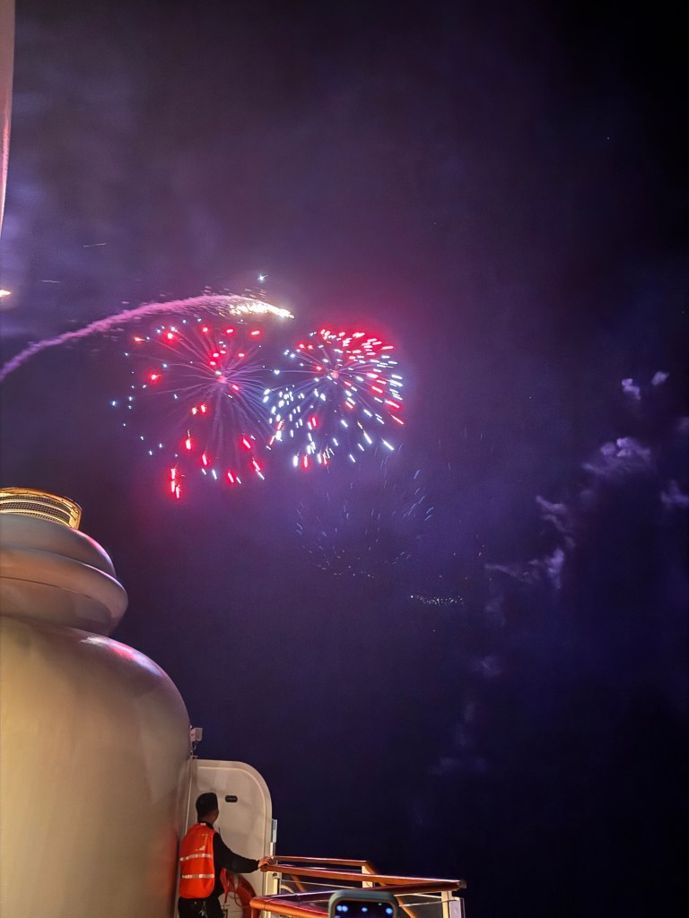 After dinner we dropped the boys off at the kids club and headed up to Meridian bar to relax and have a drink. The kids lasted about 30 minutes in there before wanting to leave. So I left to go find the girls and ran into Alysen and Brandon and we went back to Meridian. It was not really busy so we sat at the bar chatting with the bartenders. We hung out there until it was time for the fireworks. Turns out the outdoor patio area there is a really good and not crowded place to watch the fireworks.