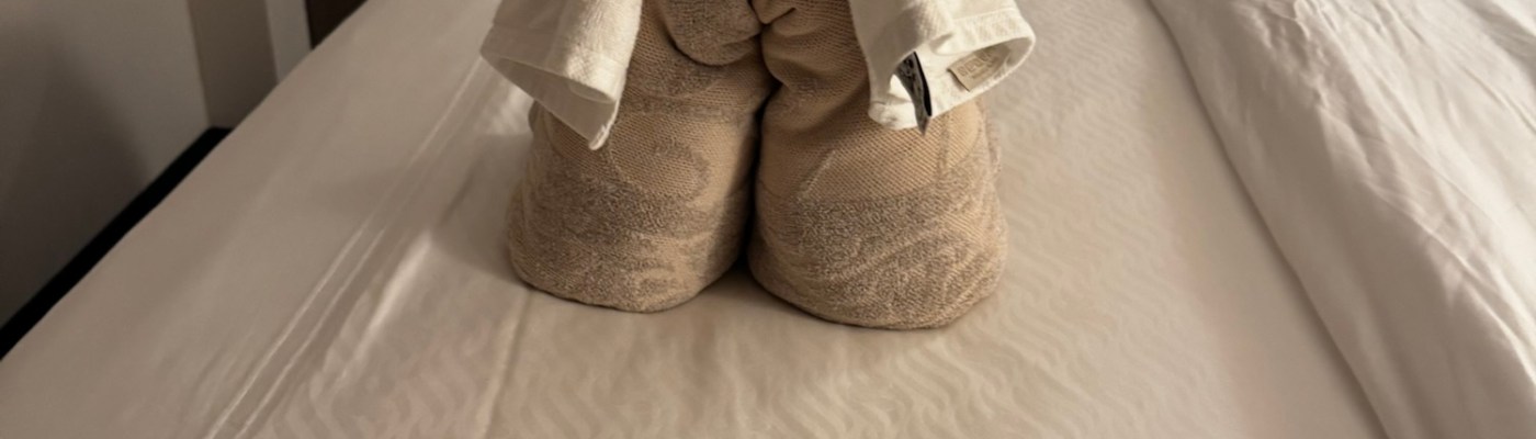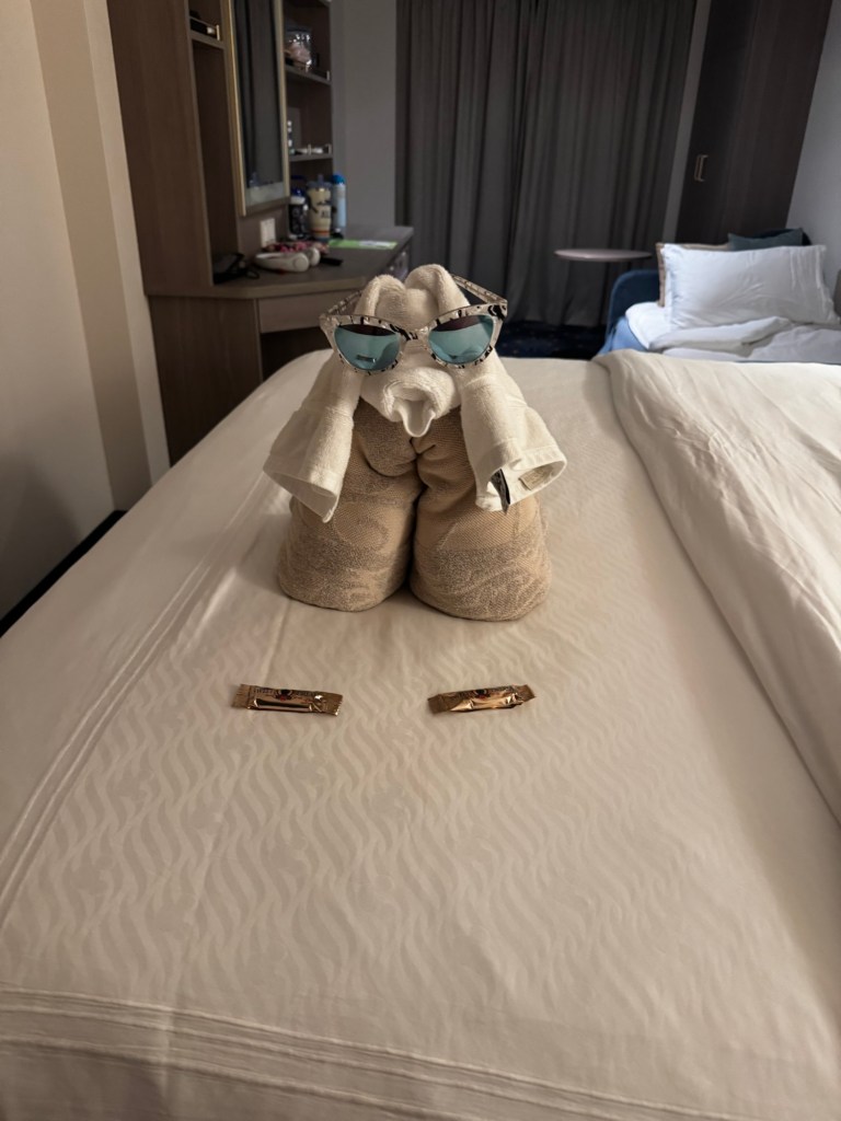 We went up to deck 14 forward to sit outside, but that didn’t last long. It was so windy and cold up there. We grabbed a towel to keep warm, but finally gave up and headed back to deck 4. It was still windy and chilly outside on deck 4 but not nearly as cold as deck 14.