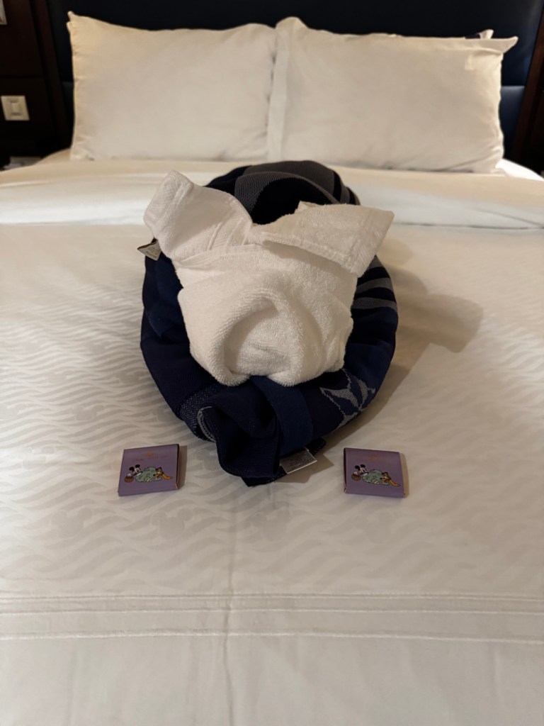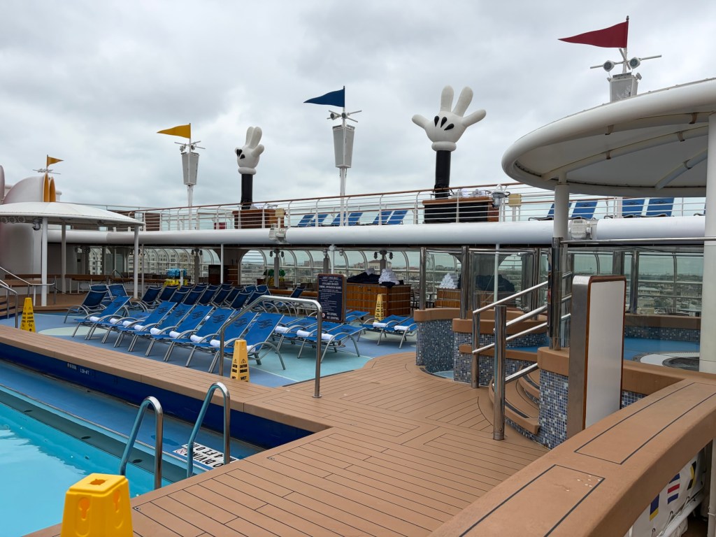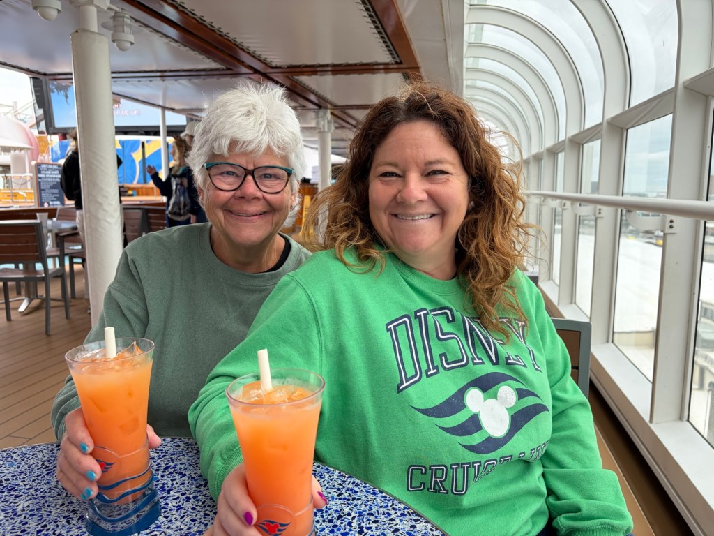 Once on the ship we headed up to deck 9 to g and some water and dad got some lunch. The funnel vision was playing Emperors New Grove so we sat outside or enjoy the views. It was windy and overcast but still nice to sit outside and enjoy the weather.