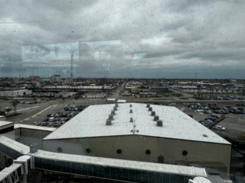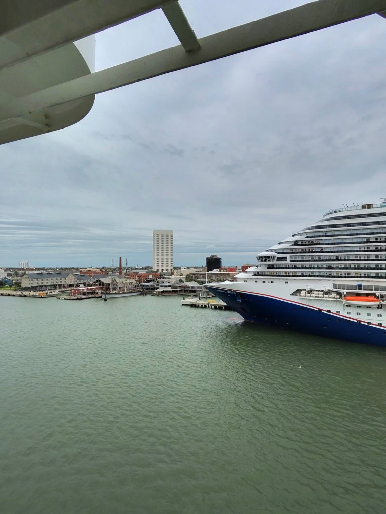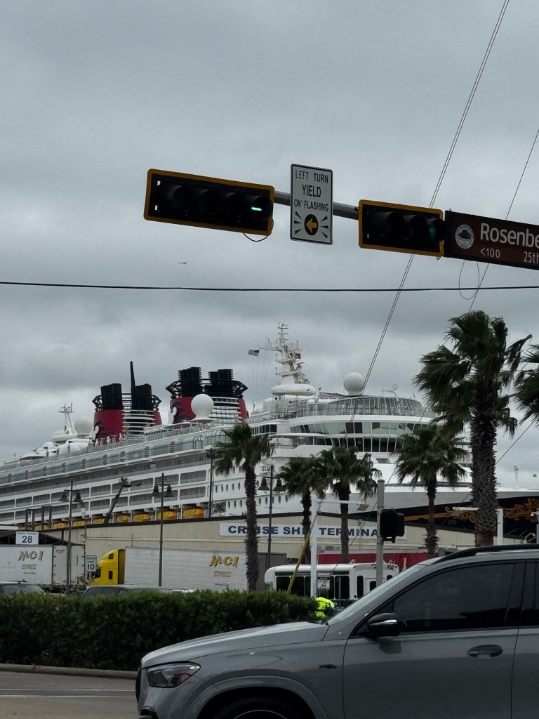 After breakfast we came back to the hotel to grab jackets! It is 64 and windy this morning and big change from yesterday when it was warm. After getting our jackets mom and I went and checked the walk to the port to figure out which street was best. since Galveston is prone to flooding the sidewalks are up high and have lots of steps to get down the street. Some areas do have wheelchair ramps but there is also a lot of brick around.