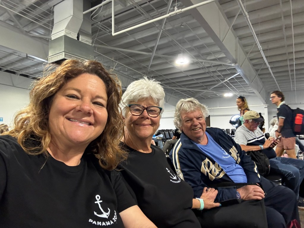 After getting our coffee it was time to head back to the hotel to get all our things packed up. Our Port of Arrival Time is noon. The walk to the port was super windy. It felt like waking into a hurricane when trying to get to the port. We stopped to regroup at one corner and I checked the weather app said 24mph winds! Luckily once we got the port they had porters right there to grab our bags. Then getting in what a little confusing for the staff they kept looking at my paper and telling me my boarding time was 12:15 but my paper said 12:00-12:15 for some reason they just kept missing the 12:00 part. We were at the port a little after 11:30 and got into the security line. It moves pretty quickly. Once through security we got into the Platinum line and check it was really easy. We maybe had to wait 5 minutes for our boarding group. Mom and Dad were boarding group 8 and I was 9.