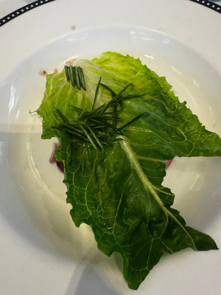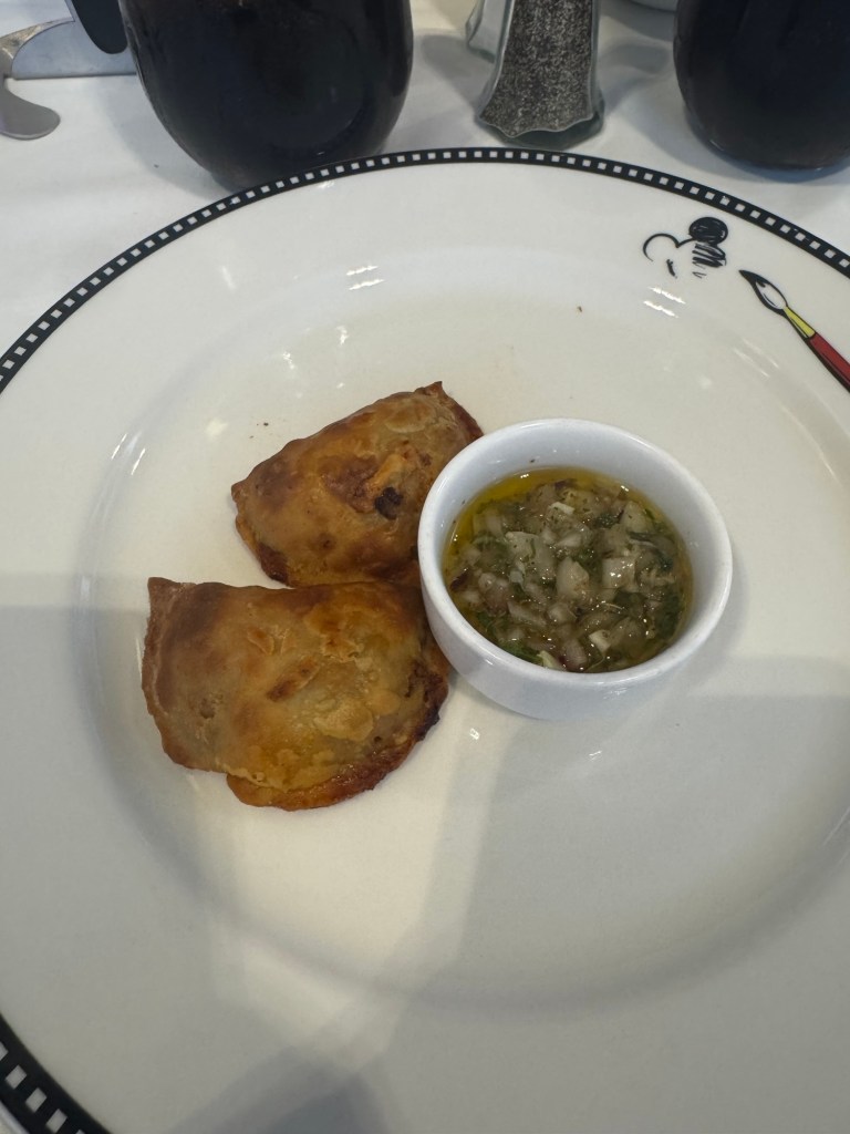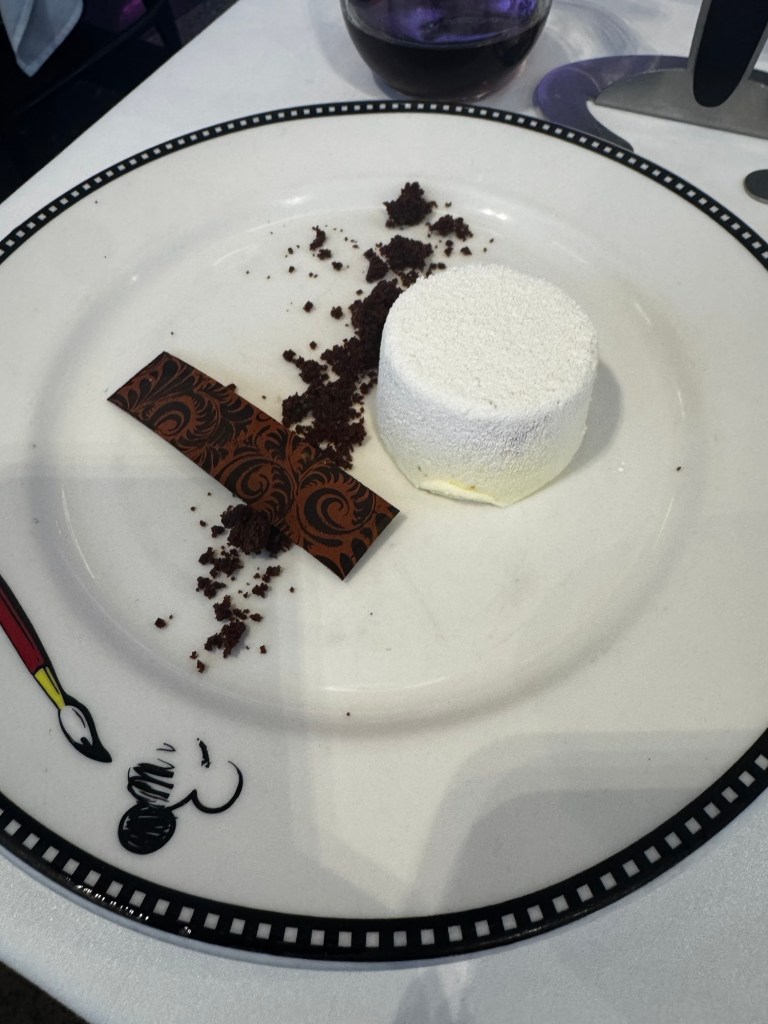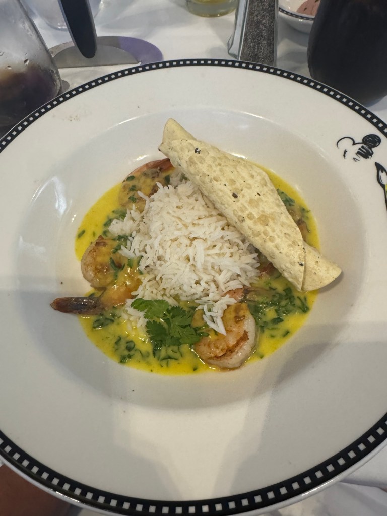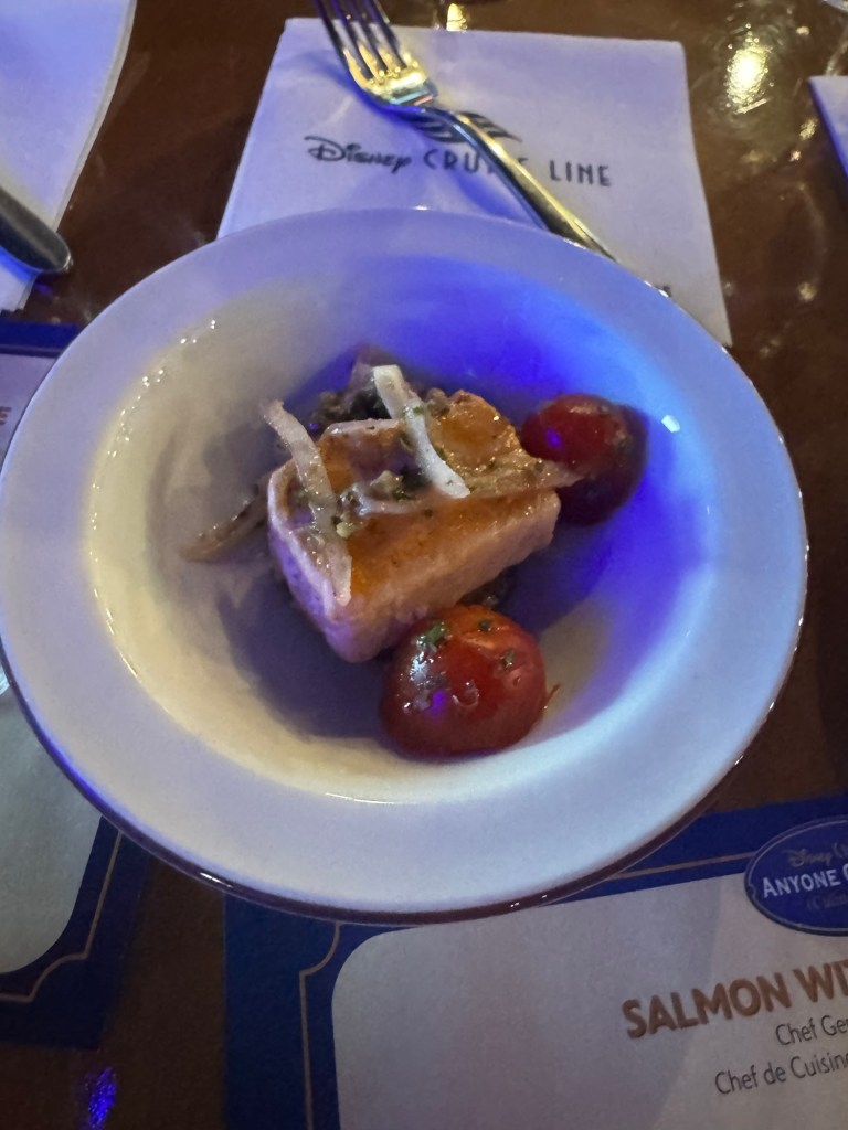 Before dinner I headed down to deck 4 to do a few laps. I saw what I think was a dolphin and some fish jumping out of the water. Dinner tonight was at Animators. So the weird piece of lettuce is a Greek salad. Underneath the piece of lettuce is tomatoes, olives, cucumbers and feta cheese.