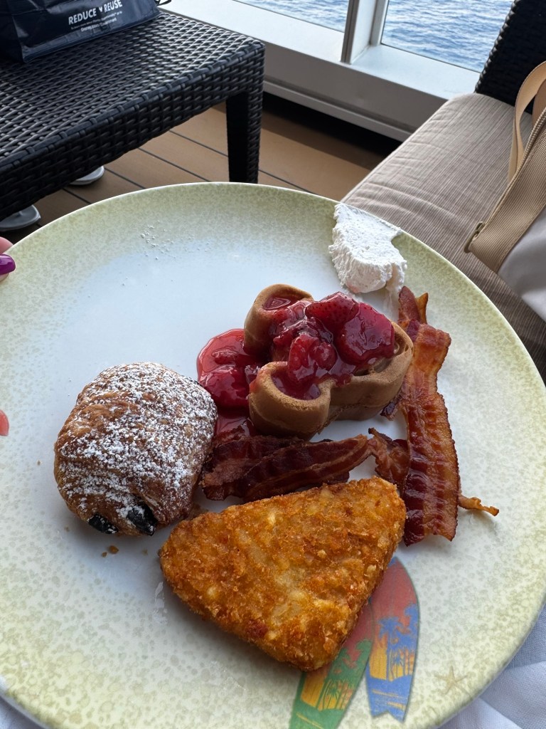 Adults get up early on this cruise for sure. Every morning before 7am there are a lot of adults in Quiet Cove. Luckily we were able to find the couches in front of cove we like to sit in and relax while drinking our coffee. Today we decided to run over to cabanas and bring our food back to our seats in Cove. The fun thing about being on long cruises is you get to know the staff better. The first day we meet Viola from Italy so we always talk to her when we see her working. She is on the same dinning rotation as our servers so we see her almost every night at dinner. I saw our server Timur and chatted with him before heading back to eat my breakfast. It was Churro waffle day again (not my favorite) luckily they still had regular Mickey waffles.