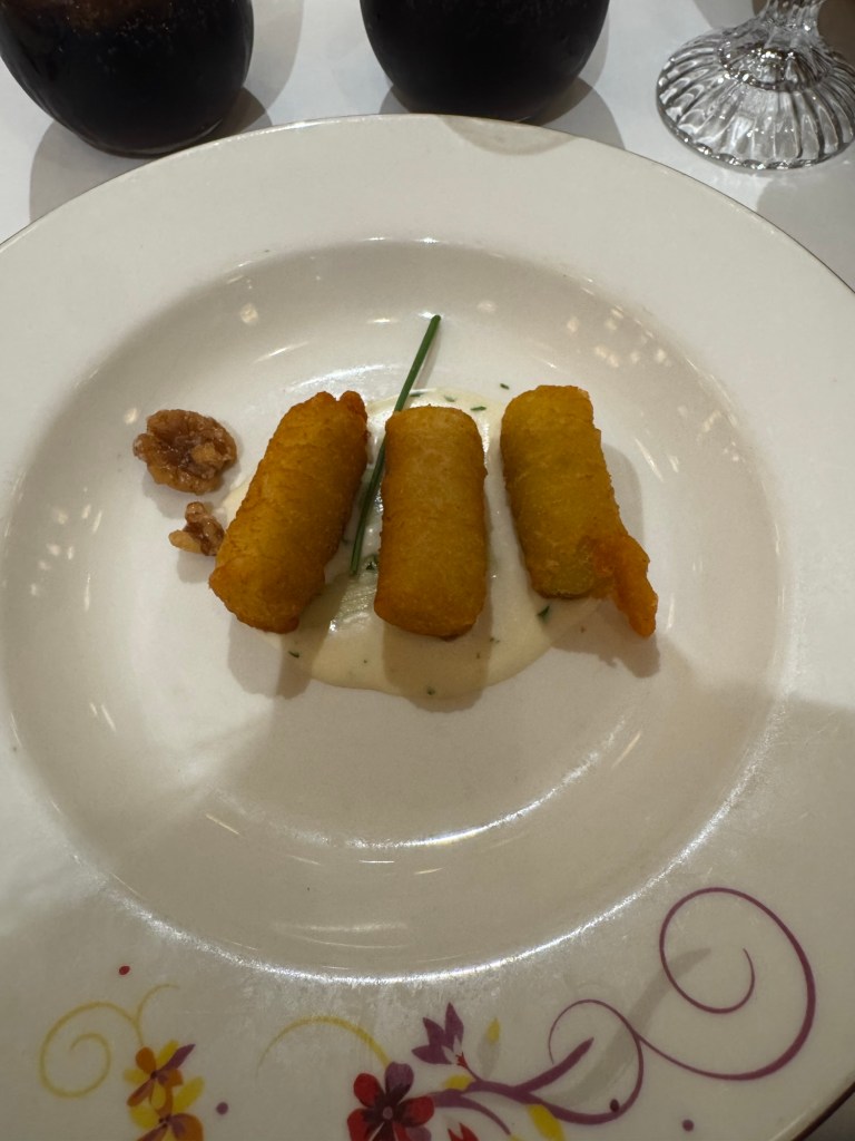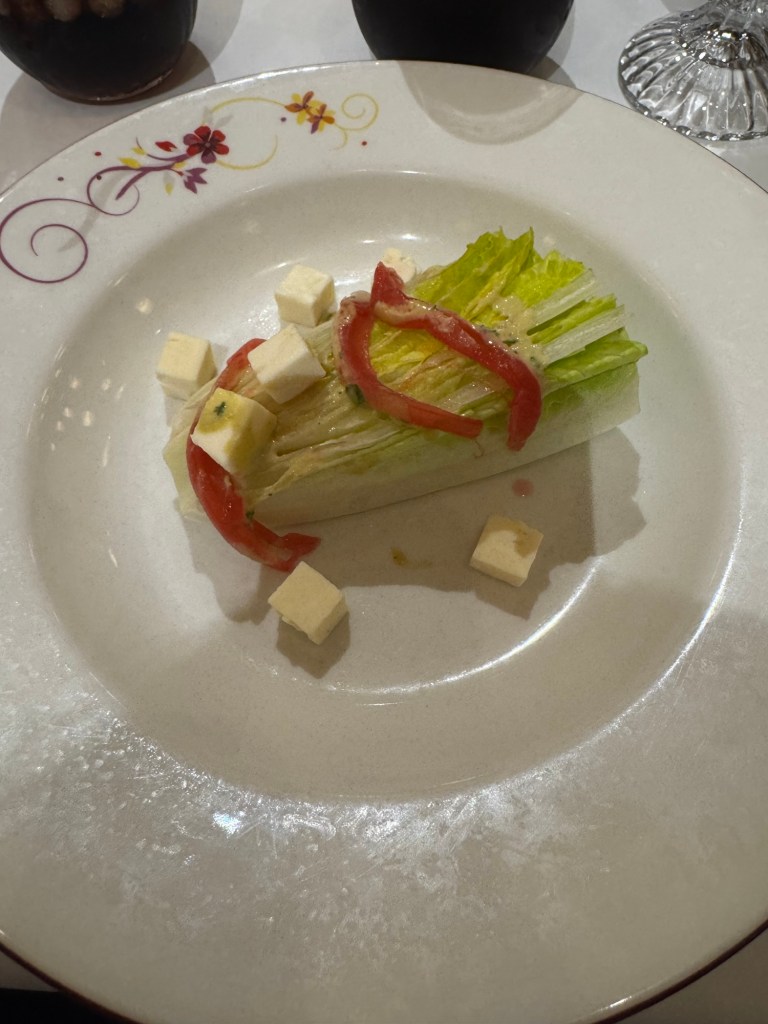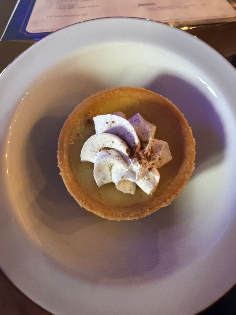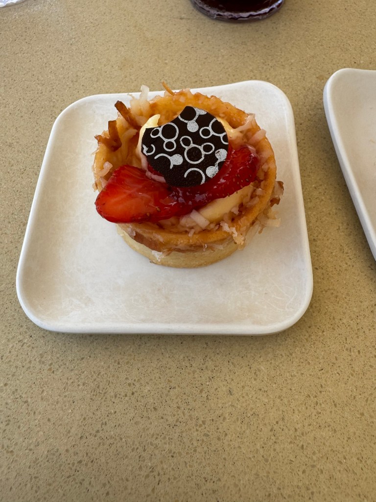When we got out we the saw Kevin our assistant server and chatted with him for a while. Then I left mom so I could go meet dad for anyone can cook. Yesterday the chef said we were moving on to dessert but the app said it was a corn cheese tart today. There was a new wine pairing which was a prosecco. The corn cheese tart was actually really good. He did say you can replace the corn with fruit or chocolate.