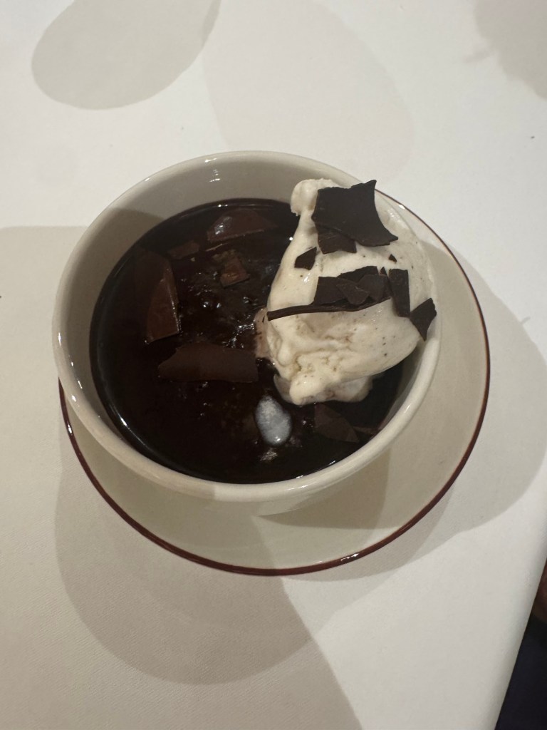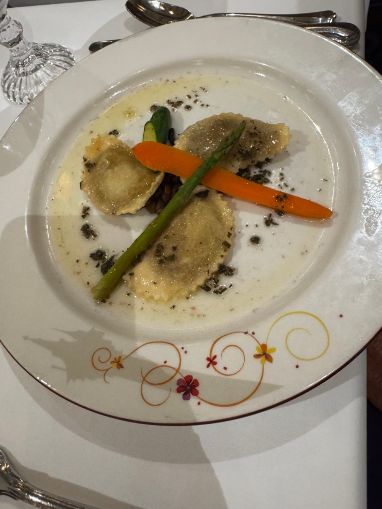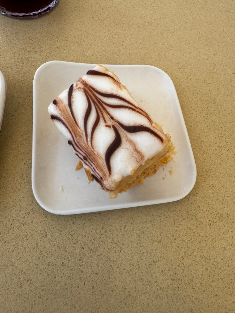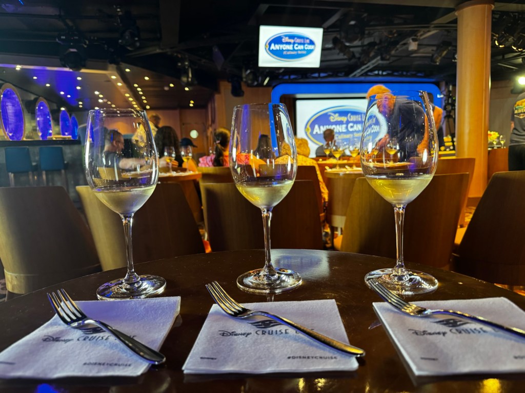 When we got out we the saw Kevin our assistant server and chatted with him for a while. Then I left mom so I could go meet dad for anyone can cook. Yesterday the chef said we were moving on to dessert but the app said it was a corn cheese tart today. There was a new wine pairing which was a prosecco. The corn cheese tart was actually really good. He did say you can replace the corn with fruit or chocolate.