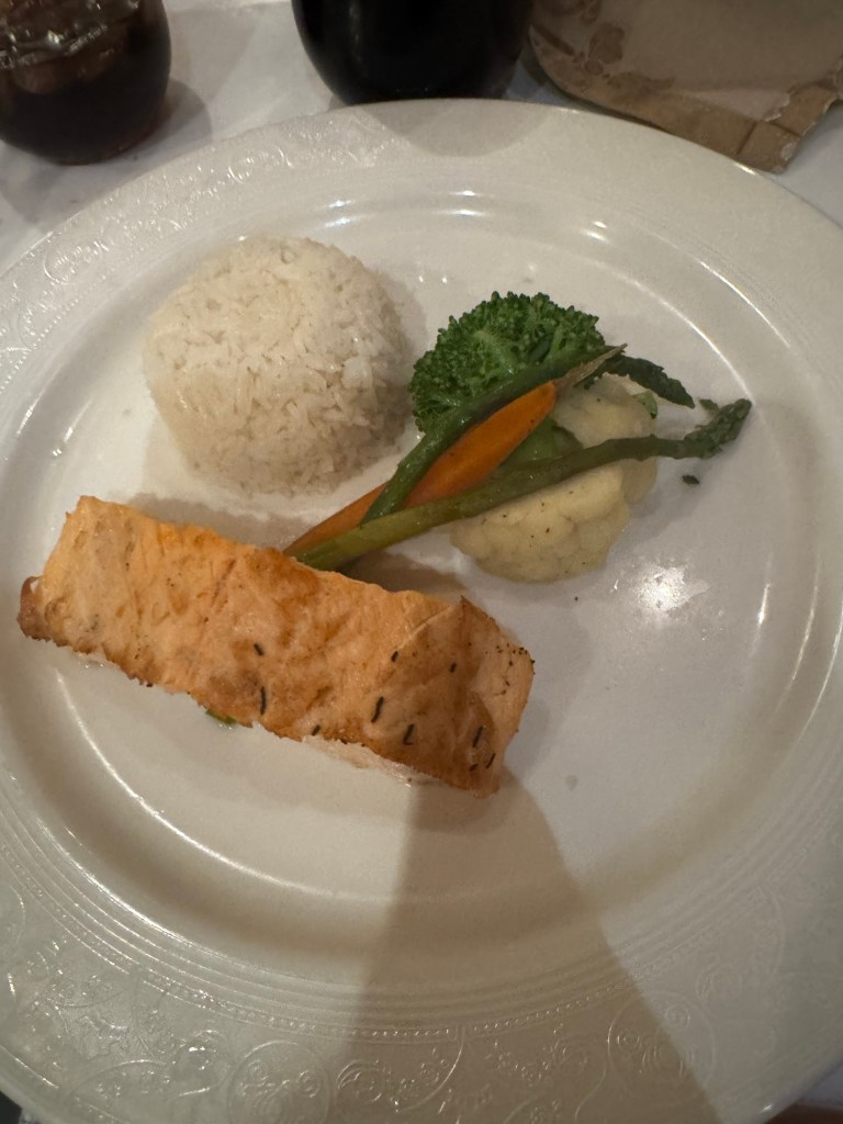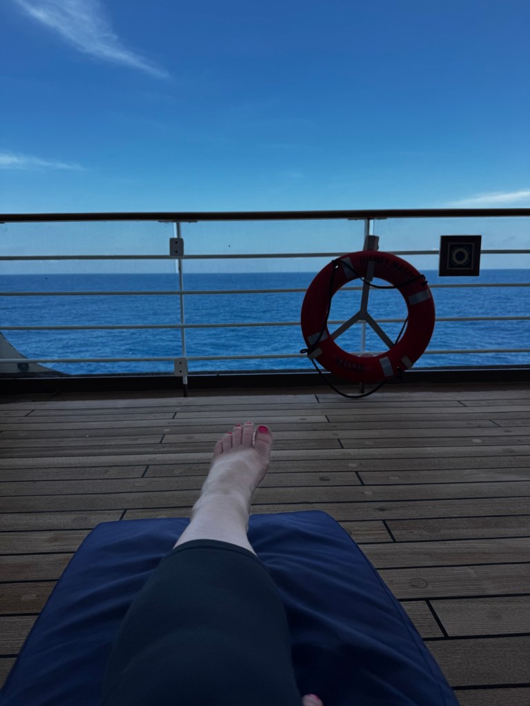 After Palo it was time to change out of nice clothes and hit Deck 4 and do a few laps. It is a little cooler today not a lot but a little nicer walking the deck. Afterwards we found a spot to sit and relax inside and tried to find Dad. Around noon I went outside and found a lounge chair on deck 4 a few minutes later another one freed up so mom came and joined me. We spent about 2 hrs just hanging out on the deck it was great.