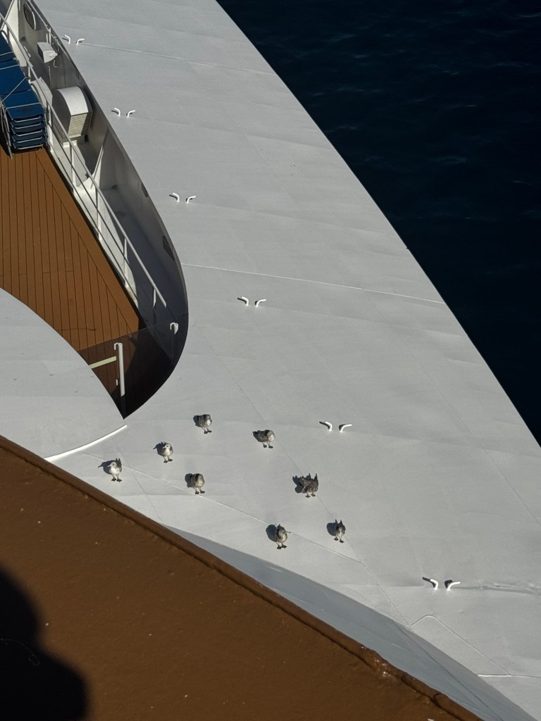 Today was a tender port so we dropped anchor away from shore and were taking the tender boats to the marina. Once the ship stopped moving seagulls decided they wanted to hang out on the ship too.