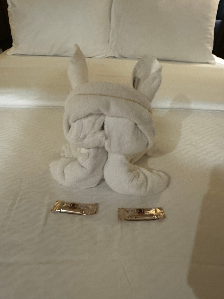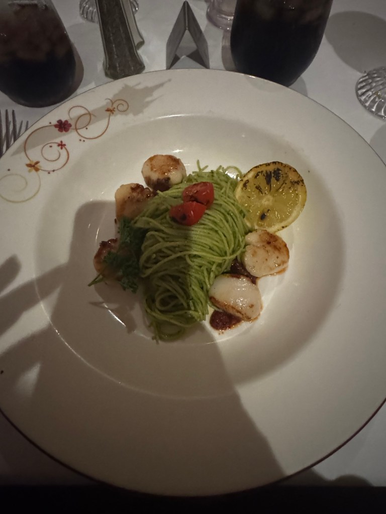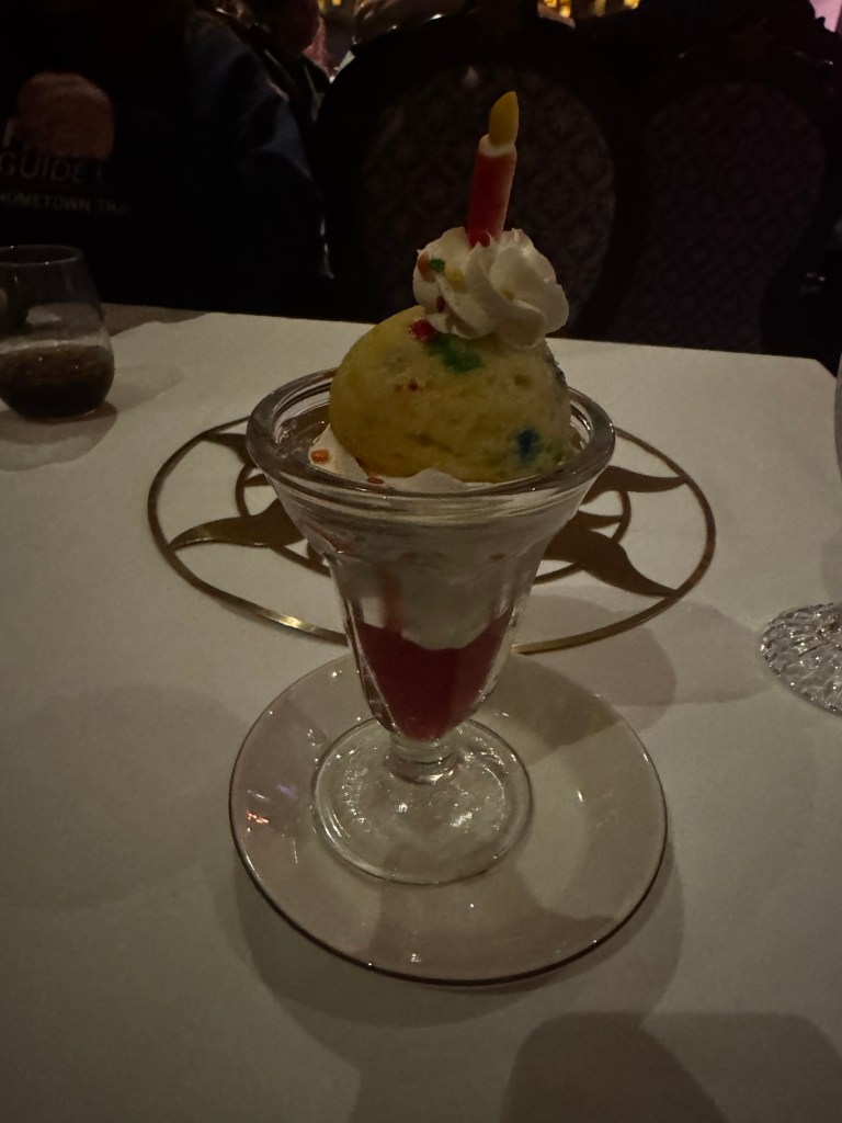 The drinks were good a little strong but good. Then it was time for dinner the last rotation at Rapunzel’s. Tonight they had some music and a celebration where people were supposed to get up and dance and walk around with the staff. We did not get up and dance with the staff. I had a house salad with raspberry dressing didn’t take a picture of that.